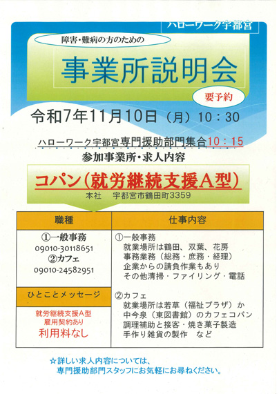 2025年11月10日(月)ハローワーク宇都宮〔宇都宮市明保野町1-4〕にて、就労継続支援A型事業所コパンの事業所説明会を行います。